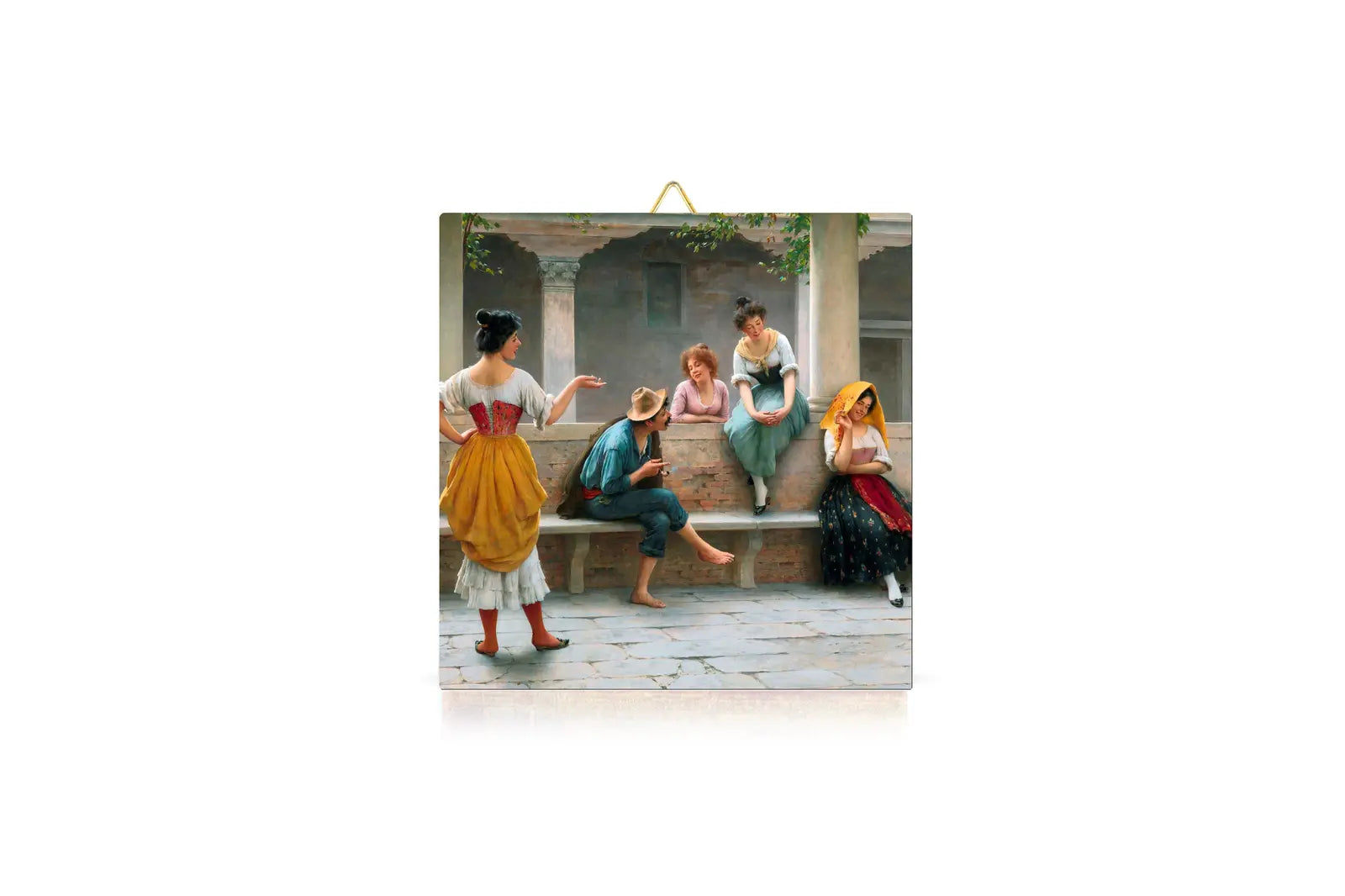 Mattonella in ceramica con stampa frontale ad alta risoluzione, lavorata a mano con effetto lucido. Il retro è munito di attaccaglia in tela gommata con gancio in metallo.