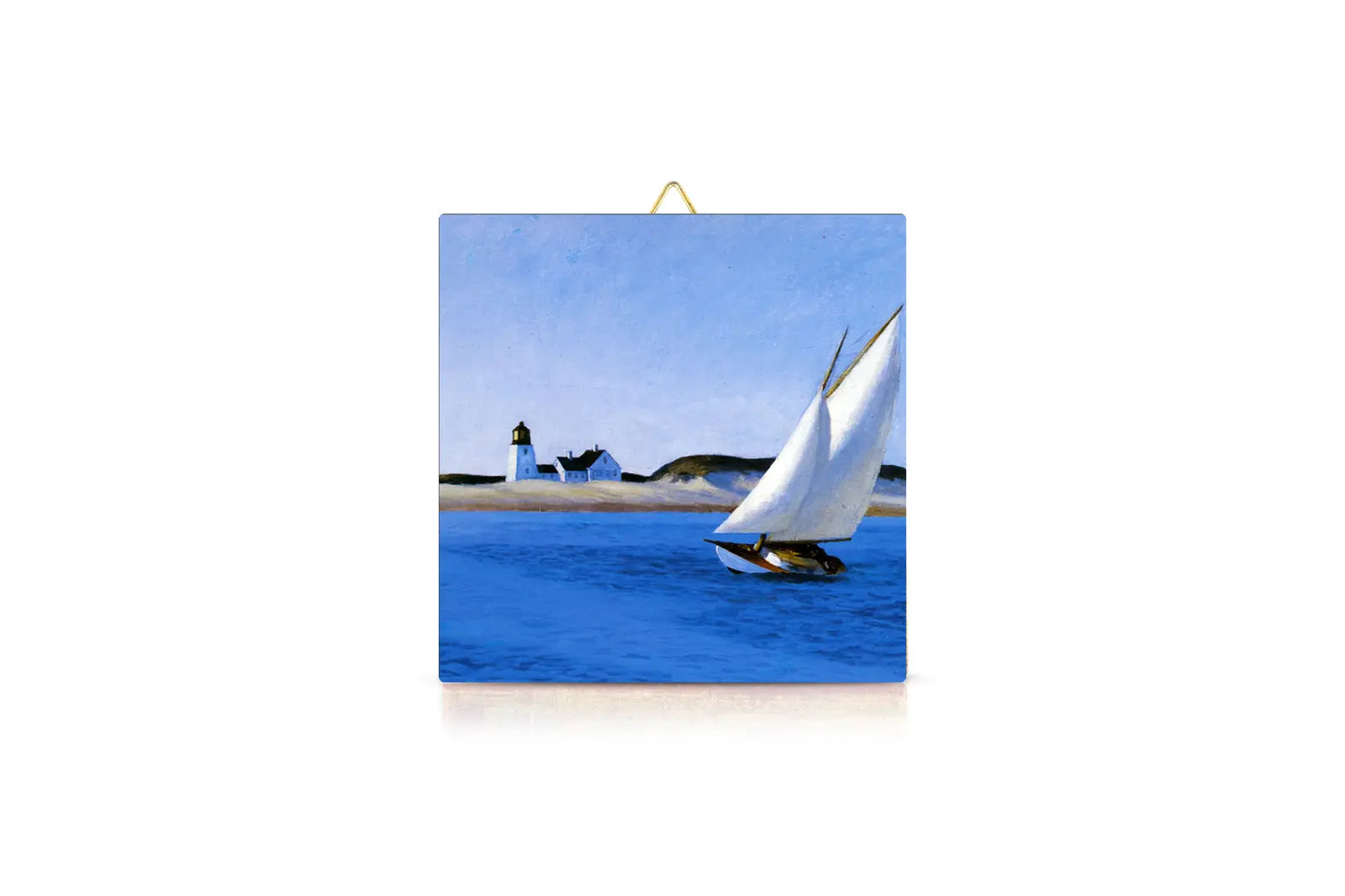 Ceramic tile with a high-resolution front print, handcrafted with a glossy finish. The back features a rubberized canvas hanger with a metal hook.